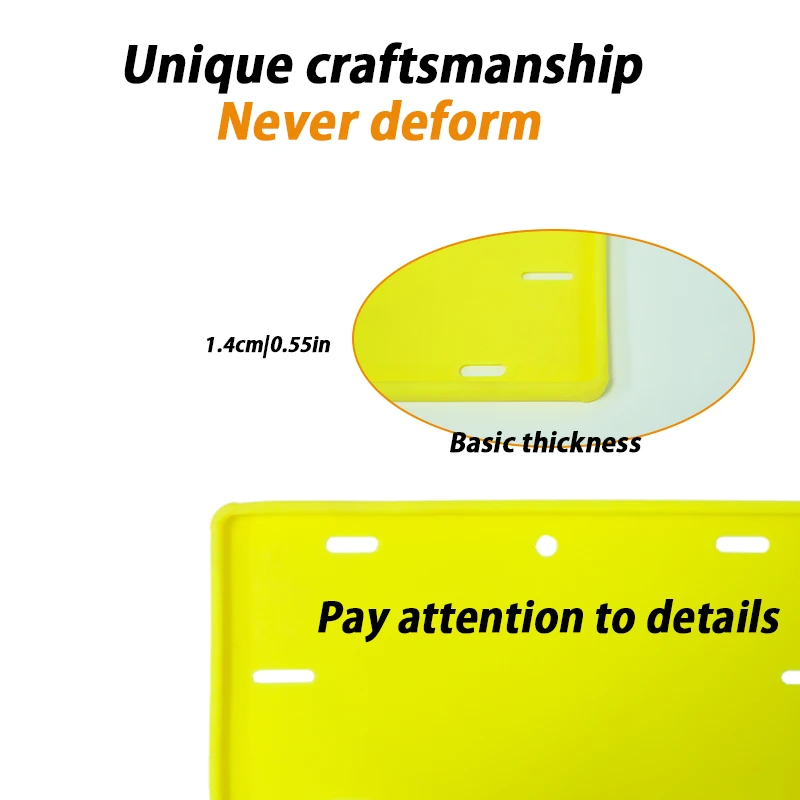 Upgrade your vehicle's look with these vibrant and durable license plate frames. Made from high-quality silicone material, these frames are built to last and withstand the elements. The soft, flexible material not only provides a sleek and modern touch to your car, but also offers protection against scratches and dents to your license plate.